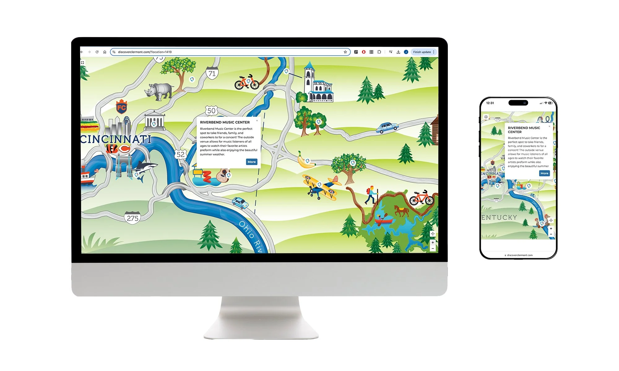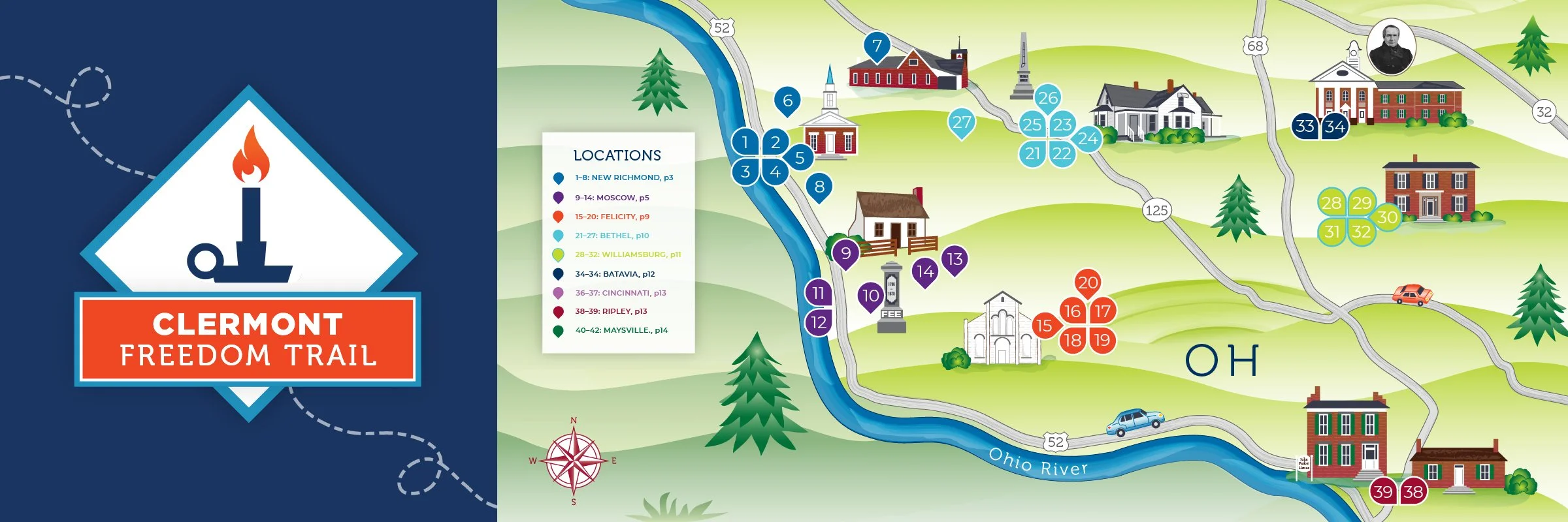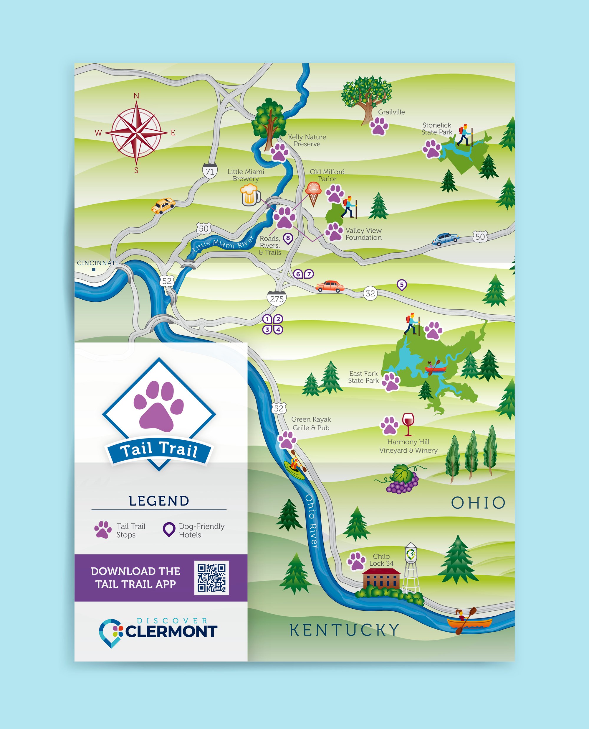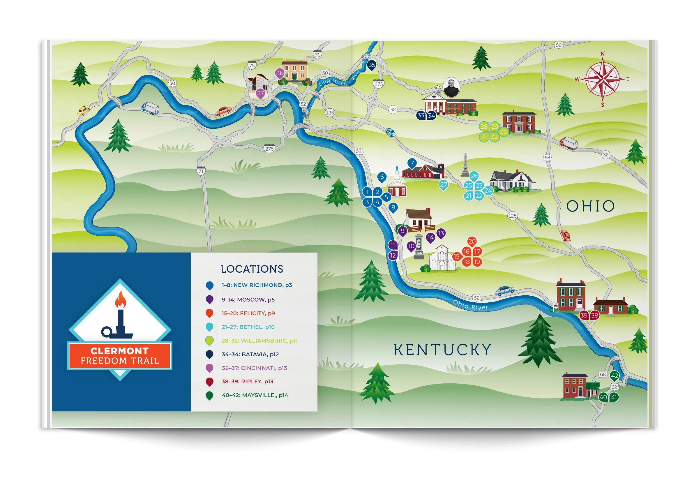 Clermont County, OH has lots to offer tourists and residents alike. Working with the Visitors Bureau, I design maps to showcase local attractions and activities. I’ve illustrated a lively map of the region, and update it regularly to highlight a variety of themes: historical tours such as the Underground Railroad and President Grant, or local gems like pizza places and dog-friendly spots. Check out an interactive visitor map on their website. I also designed a visual system for map logos, so each trail has its own identity within a consistent brand. (fun fact: Clermont is an old French word meaning “clear hills.”)