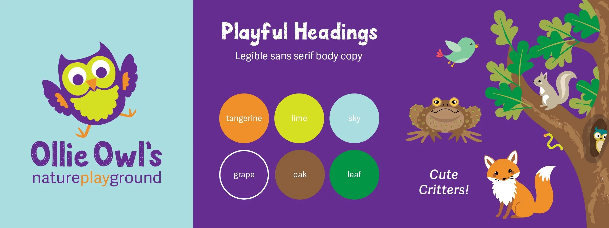 Colorful illustrated sign for Ollie Owl's nature playground, with a purple background, cartoon animals including an owl, frog, squirrel, fox, bird, snake, and other woodland creatures. Contains playful headings and color swatches labeled tangerine, lime, sky, grape, oak, and leaf.